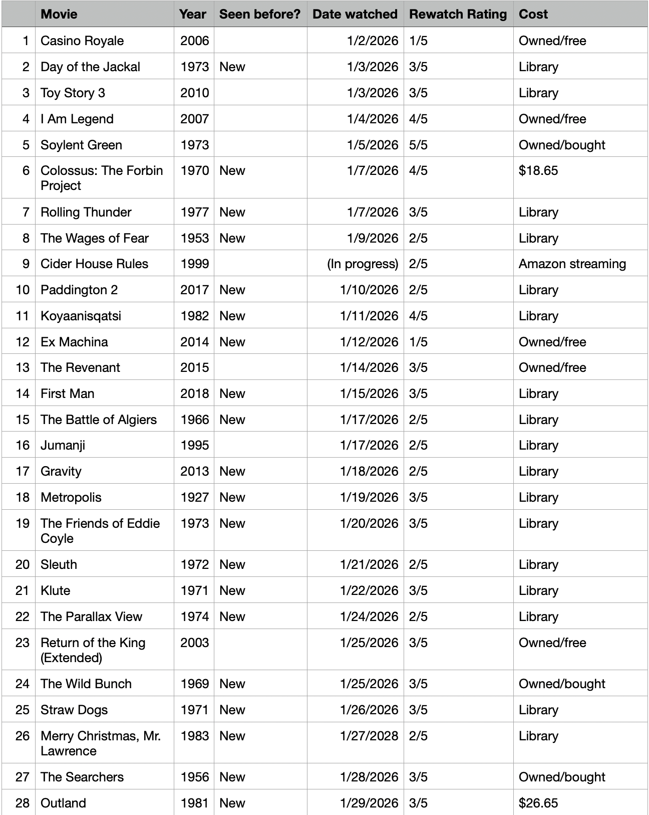 A majority of the films I have never seen before, and so far, many of them have been free from the library. The ratings are not indicating how good the movie is, but rather, how likely I am to want to rewatch the movie in the future. This is my Rewatch Rating scale: